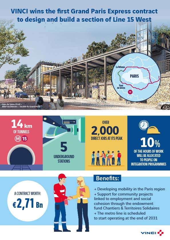 The contract is worth €2.71 billion and 20% of the works will be entrusted to local SMEs. It covers turnkey engineering and construction of 14 km of tunnels, 5 stations (Saint-Cloud, Rueil-Suresnes Mont-Valérien, Nanterre La Boule, Nanterre La Folie and La Défense), a set of tail tracks and 16 service buildings.